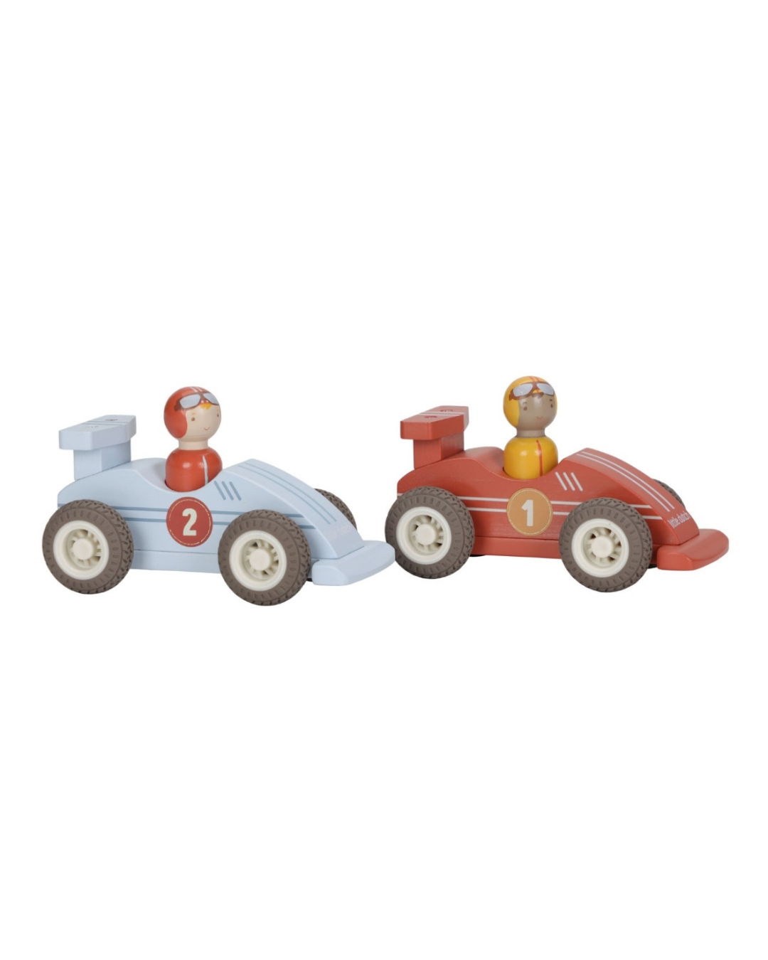 Set de voitures de course à rétrofriction. Tirez les voitures vers l'arrière, relâchez-les et regardez-les partir à toute vitesse. Chaque voiture a un joyeux pilote que vous pouvez échanger, rendant le jeu de rôle encore plus amusant. Grâce à la construction en bois solide et aux roues en caoutchouc, les voitures roulent en douceur sur le sol. En route vers la ligne d'arrivée !
